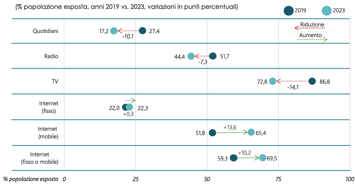 Il grafico mostra un confronto temporale sull’uso dei mezzi di informazione, dal 2019 al 2024. Solo negli ultimi anni la maggior parte degli Italiani ha iniziato a usare internet e i social media come fonte principale di informazione al posto dei media tradizionali (fonte qui, da cui è tratto anche il grafico di sopra). Come ho già scritto in uno dei primi articoli del blog, questo è un male, perché i social network sono comunque piattaforme private che devono far cassa. Non esiste un codice deontologico per le informazioni che l’algoritmo mostra agli utenti, per i giornalisti invece sì.